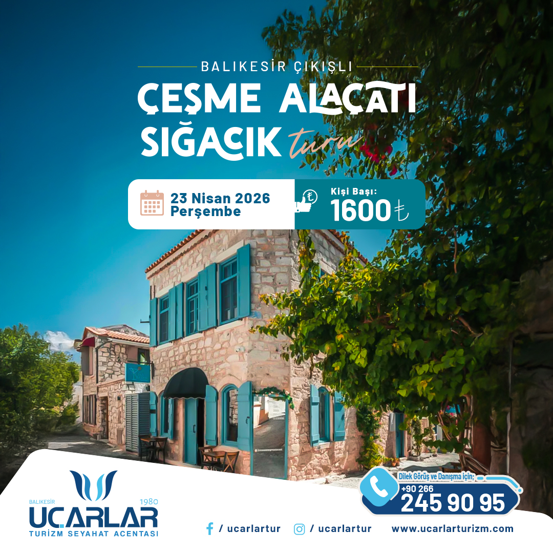 Seferihisar sahilindeki en önemli yerleşimlerden biri olan Sığacık mevkiine geçiyoruz. rehberimiz eşliğinde eski kale içini gezdikten sonra burada serbest kahvaltı için mola veriyoruz. Öğle saatlerinde antik dönemde ismi Agrillia günümüzdeki ismi ise Alaçatı'ya ulaşıyoruz. Kendine özgü taş mimarisi, asma bahçeleri, Yel değirmenleri ve rüzgârı ile ünlü bu güzel kasabada vereceğimiz serbest zamanda dileyenler taş evler in avlusunda öğle yemeklerini alabilirler. Alaçatı'nın taşla kaplanmış daracık sokaklarında dolaşıp, bol bol fotoğraf çekip, yöresel lezzetlerin tadına bakabilirsiniz. Vereceğimiz serbest zaman sonrasında tarihteki 12 İon kolonisinden biri olan ve antik dönemdeki ismi Erythrai olan Türk turizm inin gözbebeği Çeşme ye ulaşıyoruz. Burada biraz olsun yol yorgunluğunu atıp, dinlenmek üzere kısa bir mola veriyoruz. Dileyen misafirlerimiz 1508 yılında ll. Beyazıt'ın yaptırmış olduğu muhteşem deniz manzaralı Çeşme kalesini ziyaret edebilirler. Çarşısında verilen serbest zamanı takiben, dönüş için hareket ediyoruz.