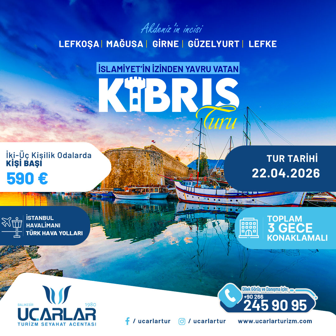 22 Nisan Çarşamba sabahı İstanbul havalimanı dış hatlar gidiş terminali’nde saat 07:00’da buluşuyoruz. Türk havayolları TK976 tarifeli sefer ile saat 10:05’te Kıbrıs’a uçuşumuzu gerçekleştiriyoruz. Yerel saat 11:45’te Ercan havalimanına varış itibari ile Rehberimiz ve transfer aracımız ile buluşuyor ve zaman kaybetmeden turumuza başlıyoruz, İlk durağımız Kırklar Türbesi M.S 7. Yüzyılda Kıbrıs adasına yapılan İslam Akınlarında şehit olan 40 sahabenin kabirlerinin bulunduğu türbeyi ziyaret ediyoruz maneviyat yüklü bu ziyaretimizle turumuza yoğun duygular içinde devam ederek, Başkent Lefkoşa’ya geçiyoruz burada sırası ile Barbarlık Müzesini ziyaret ediyoruz. Tabib Binbaşı Nihat İlhanın eşinin ve üç çocuğunun küvette katledildiği ev olan müzeyi ziyaret ettikten sonra panoramik olarak Yeşil hattı görüyoruz. Turumuzun devamında Lefkoşa Surlar içi gezisi olacak. Anıtsal Girne Kapısında otobüsümüzden inerek gezimize yürüyüşle devam ediyoruz. İlk olarak Kıbrıs Türk Tarih Kültür ve Milli Mücadele Müzesini geziyoruz. Ardından, Kıbrıs Mevlevihanesi, Samanbahçe Evleri, Sarayönü Meydanı, Dikilitaş, Arasta Çarşını ikiye ayıran Lokmacı Sınır Kapısını görerek gezimizi tamamlıyor ve Büyük Handa serbest zaman veriyoruz. Verilen saatte toplanıp otobüse dönüyoruz ve otelimize geçiyoruz akşam yemeği ve konaklama otelimizde.